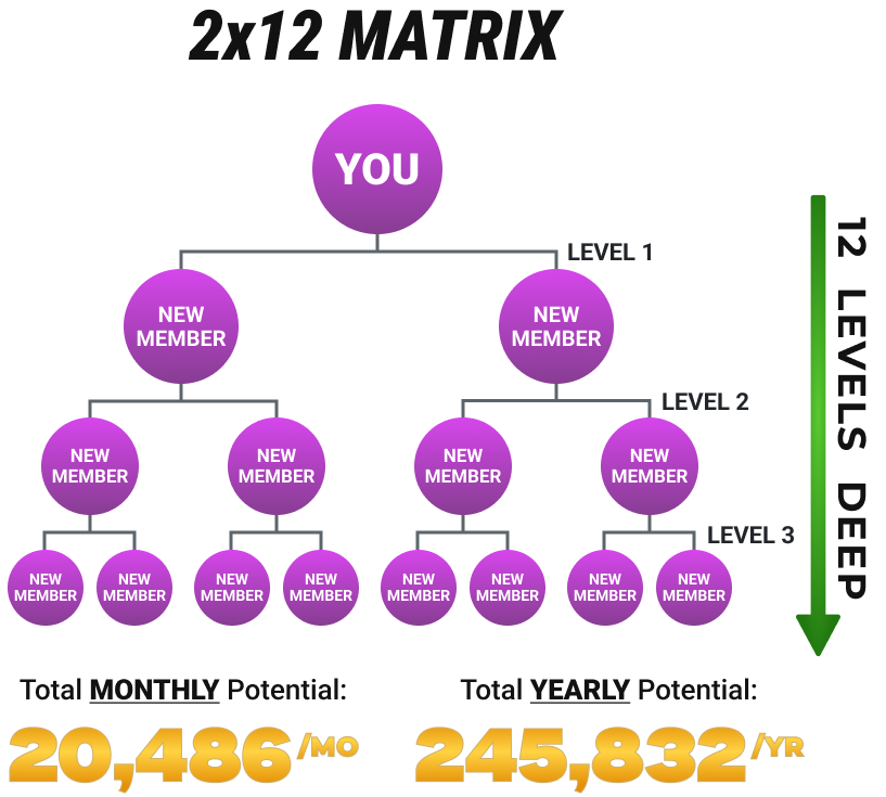 This 2x12 Matrix showcases the incredible income potential that can unfold as positions fill throughout your organization. Powered by team growth, duplication, and spillover, the matrix can grow across 12 levels — unlocking the potential to earn up to $20,486 per month or $245,832 per year on a fully filled matrix. This is what makes the opportunity so exciting: as your team expands and momentum builds, each filled level can add to your residual income potential and create a powerful path toward long-term growth.