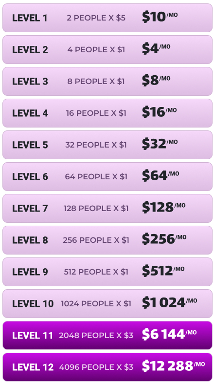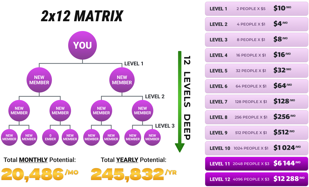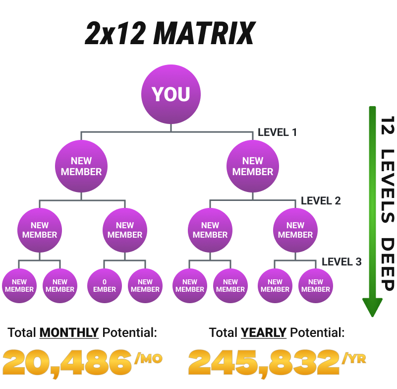 This 2x12 Matrix showcases the incredible income potential that can unfold as positions fill throughout your organization. Powered by team growth, duplication, and spillover, the matrix can grow across 12 levels — unlocking the potential to earn up to $20,486 per month or $245,832 per year on a fully filled matrix. This is what makes the opportunity so exciting: as your team expands and momentum builds, each filled level can add to your residual income potential and create a powerful path toward long-term growth.